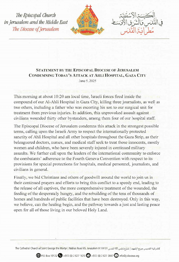 Diocese of Jerusalem condemns attack on Ahli Hospital Post author:Helen Perry Post published:05/06/2025 Post category:Church / Cyprus / News / The Gulf You Might Also Like Coronavirus, Church & You Survey 10/06/2020 Archdeacon in the Gulf gets to know St George’s 21/03/2023 Bishop’s Task Force meets in hybrid session 12/05/2025