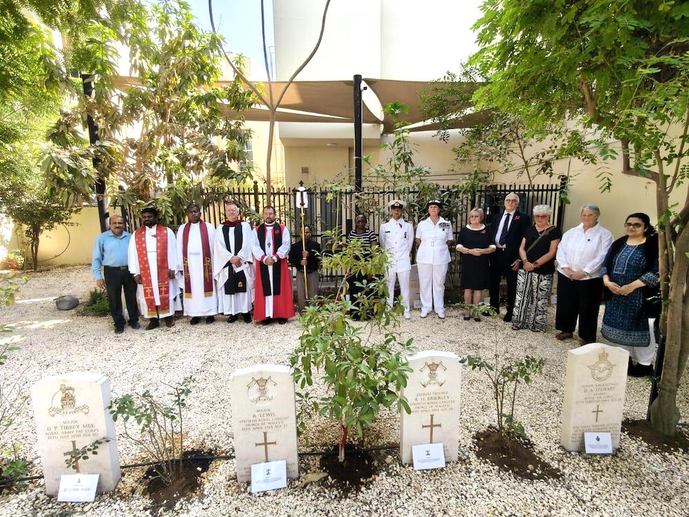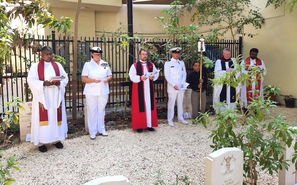 At 11 o’clock this morning—Armistice Day—clergy of the Diocese, the Church of North India, and the Church of South India joined serving members of the Royal Navy and Royal New Zealand Navy for a moving service of remembrance led by Bishop Sean at St Martin’s graveyard—site of the former cemetery of the British Royal Air Force Station Sharjah, and the graves of 12 service personnel who died on peacetime operations in the 1960s.