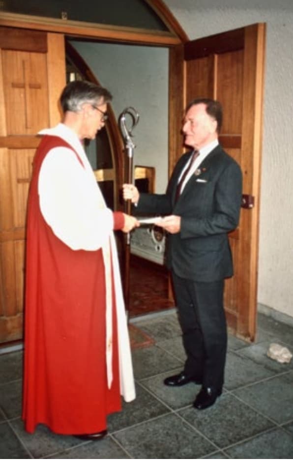 Below left: Bishop Harry Moore handing his crosier and Episcopal Mandate to Major Gerald Green on 23 April 1986, St Helena Larnaca (The Unfolding Story: The Anglican Diocese of Cyprus and the Gulf; St Christopher’s Cathedral archive)