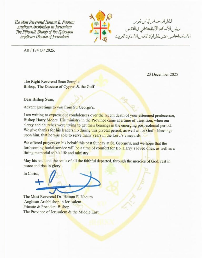 On Sunday (21 December), Archbishop Hosam offered prayers at St George’s in Jerusalem on Bishop Harry’s behalf. Expressing his condolences, Archbishop Hosam said of Bishop Harry, “His ministry in the Province came at a time of transition, when our clergy and churches were trying to get their bearings in the emerging post-colonial period. We give thanks for his leadership during this pivotal period, as well as for God’s blessings upon him, that he was able to serve many years in the Lord’s vineyards.”